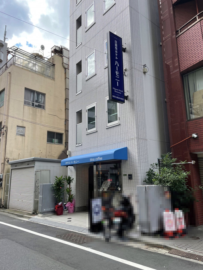非常に細長いホテルで1階には喫茶店が入っています。その横の通路のようなところにフロントがあります。