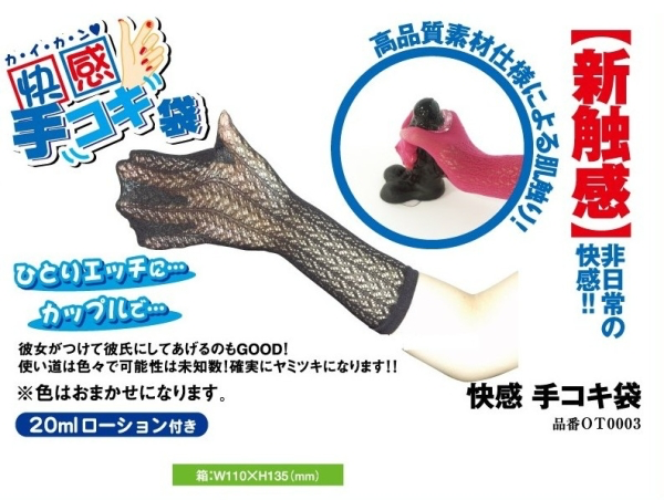 そのグッズは「快感手コキ袋」と命名されていて、画像を見ると、洗濯機で使うようなネット状の生地を手袋にしたような形状をしています。色は黒や白、青などいろいろあるようで、価格は300円程度と非常に安価です。ミニローションがおまけでついているものもあり、お試ししてみるには手ごろな感じです。