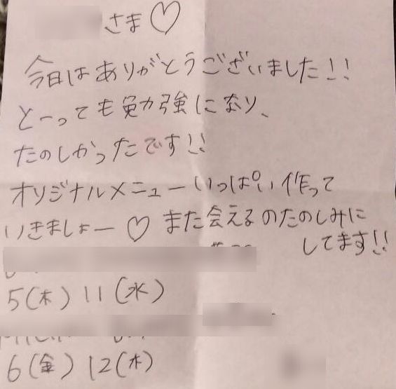 帰り道にAちゃんからもらったお手紙を開けると、なんとまあ心温まりますね~。勃起はおさまりませんけどw