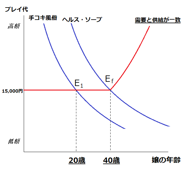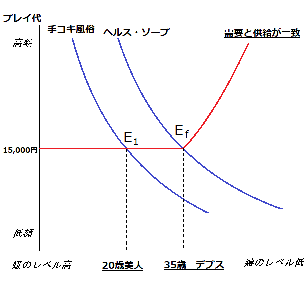 手コキ風俗経済の需要と供給のグラフで見るとこんな感じになります。