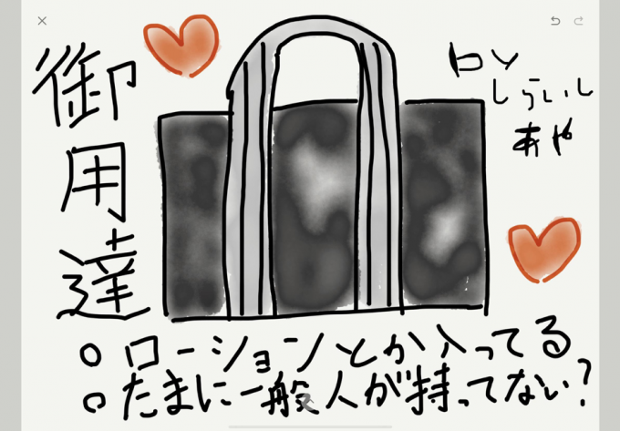 だいたいホテヘルと言うと、上記のイラストのようなバッグを持たされる。中にはローションやら無香料のボディソープやら、仕事に必要な道具が入っているのだ。