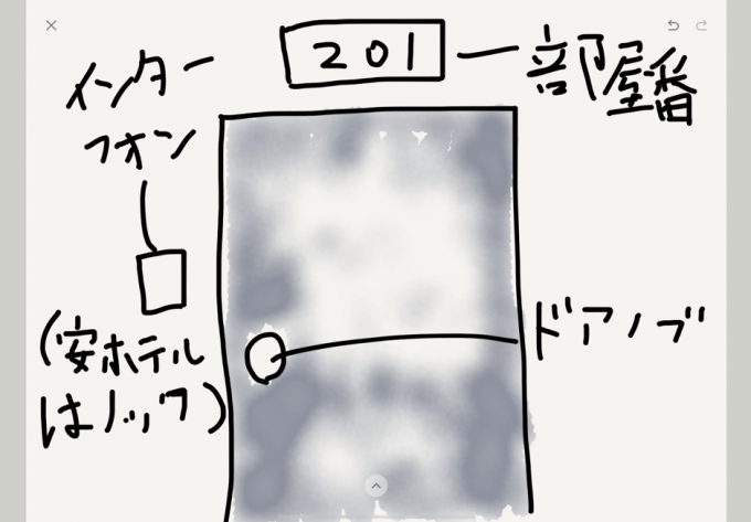 完全に記憶を捻りだして書いたのだけど、典型的なラブホのドアってこんな感じじゃないだろうか。(画力なさすぎ問題)