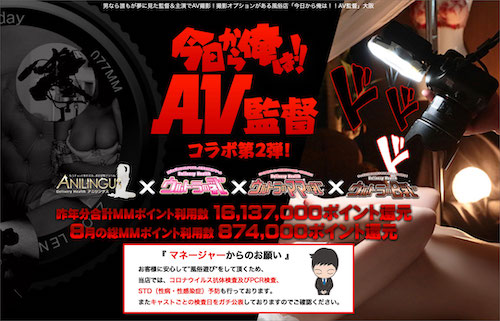 どこかで聞いたタイトルですが(笑)、AV監督になりきってプレイができるデリヘルです。仮面をつけて顔出しなし、顔出し有のコースあります。しっかりと最初から最後まで撮影ができるので(本番はダメ)、夢のAV監督兼男優になれます。