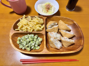 おいなりさんの他に冷奴、そら豆、マカロニサラダも美味しかったです??