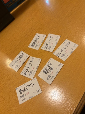 最初に飲みたいもの、食べたいものを食券機で買って、その食券にテーブル番号を記入してカウンターに持って行くとお酒や食事が届くというシステム🍻