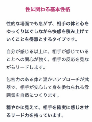• F (Follow): 相手にリードしてもらい、身を委ねたいタイプ。相手のペースに合わせたり、導かれることで安心感や快感を得るのが得意