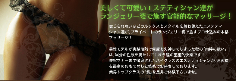 睾丸マッサージ・リンパマッサージ等の回春マッサージでアナタの性感をMAXに! ・モデル系に等しい美女が、アナタの心身の疲れを妖艶な姿で癒します! ・高級エステに負けないハイクオリティマッサージはプロのマッサージスクール直伝! ・肩コリ、背中の重み、足のだるさ、腰の痛み等、自慢のテクニックで本気で癒しに行きます! ・本当にキレイでカワイイ女性達が、アナタの身体の疲れを癒し、同時に性欲まで満たします! ・セクシーなランジェリー姿で。そしてオールヌードで。貴方に密着して施す本格オイルマッサージ! ・”愛撫”という名がピッタリ!”肉棒”の為に編み出された究極の”肉棒マッサージ”! ・アナタは1分も耐えられないでしょう!研究段階で男性モデルが幾度も昇天した究極の手コキ! | |