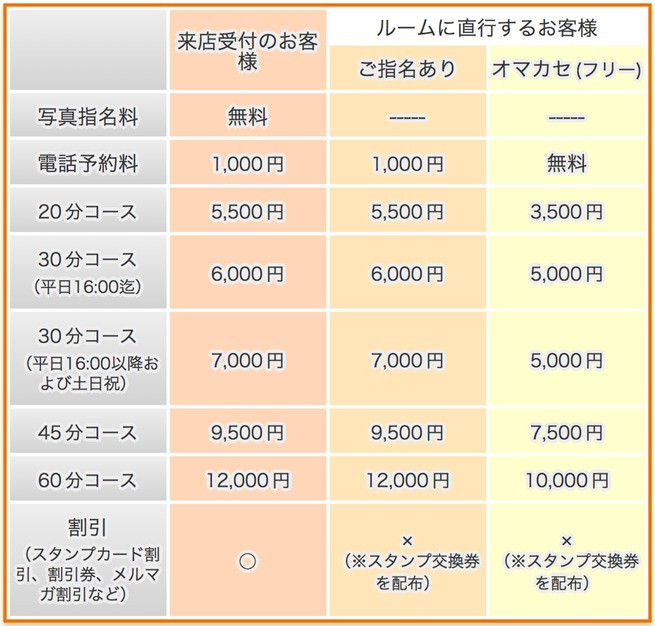 ※ご来店のお客様もオマカセ割にすることが可能です。その場合は必ず受付の最初の段階でスタッフに「オマカセで」とお申し付けください。出勤中の女の子の写真をお見せしたあとではオマカセ割は適用できませんのでご注意ください。